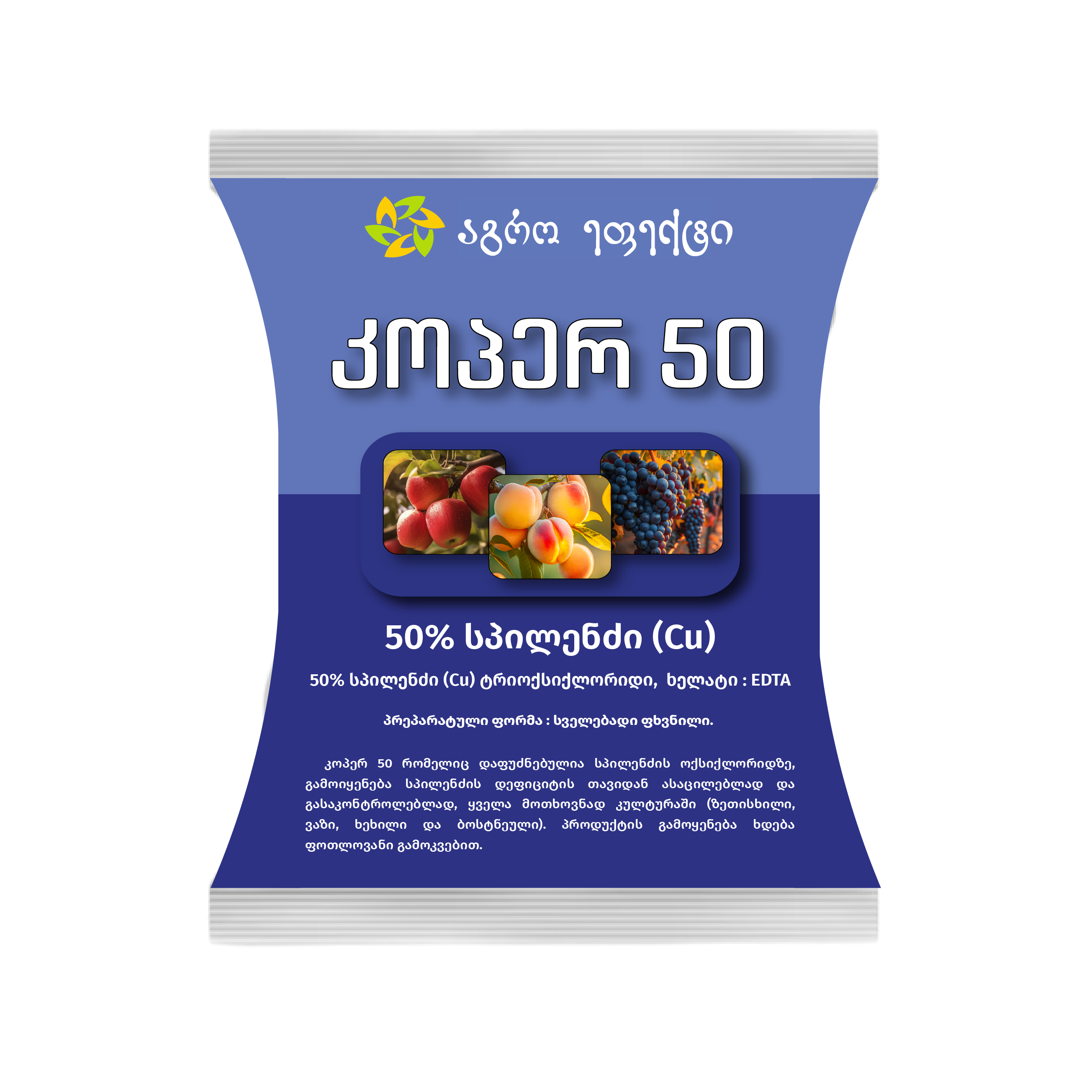 მოქმედების მექანიზმი: კოპერ 50 უმაღლესი ხარისხის უახლესი პრეპარატი, რომელიც დაფუძნებულია სპილენძის ოქსიქლორიდზე, გამოიყენება სპილენძის დეფიციტის თავიდან ასაცილებლად და გასაკონტროლებლად, ყველა მოთხოვნად კულტურაში (ზეთისხილი, ვაზი, ხეხილი და ბოსტნეული). სპილენძის იონები გამოთავისუფლდება წყალში გახსნის შემდეგ და კონტაქტური გზით ეფექტურად ანადგურებს მცენარეთა დაავადებების გამომწვევ პათოგენებს. პროდუქტის გამოყენება ხდება ფოთლოვანი გამოკვებით.