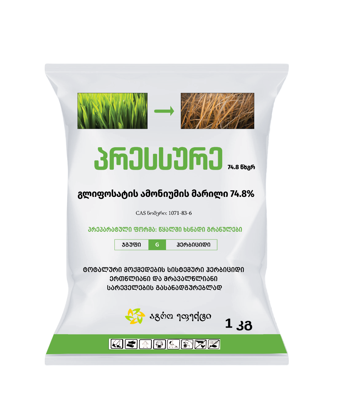 მოქმედი ნივთიერება: გლიფოსატის ამონიუმის მარილი 74.8%